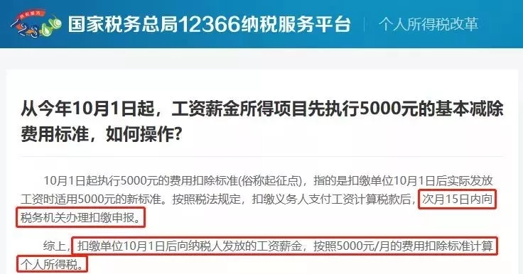 答复:10月1日起执行5000元的费用扣除标准(俗称起征点),指的是扣缴单位10月1日后实际发放工资时适用5000元的新标准。