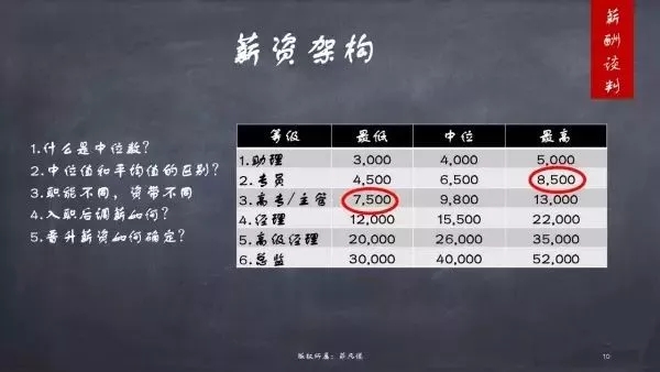 比如有5个市场专员的薪酬数据,分别是5000,5500,6000,8000,10000,排在中间也就是第三名的数字,6000,就是市场专员的中间值。