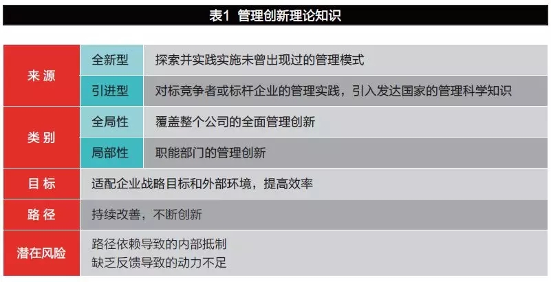 以企业职能部门的管理而言,所谓管理创新,包括研发管理创新、生产管理创新、市场营销管理创新、采购和供应链管理创新、人力资源管理创新、财务管理创新、信息管理创新等。那么,管理创新来源在哪?存在哪些风险?如何应对?应采取怎样的创新路径?(见表1)