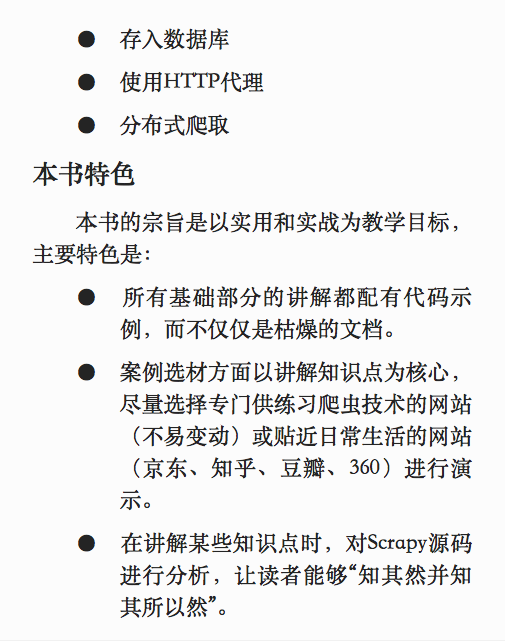 本书深入系统地介绍了Python流行框架Scrapy的相关技术及使用技巧。全书共14章,从逻辑上可分为基础篇和高级篇两部分,基础篇重点介绍Scrapy的核心元素,如spider、selector、item、link等;高级篇讲解爬虫的高级话题,如登录认证、文件下载、执行JavaScript、动态网页爬取、使用HTTP代理、分布式爬虫的编写等,并配合项目案例讲解,包括供练习使用的网站,以及知乎、豆瓣、360爬虫案例等。 本书案例丰富,注重实践,代码注释详尽,适合有一定Python语言基础,想学习编写复杂网络爬虫的读者使用。