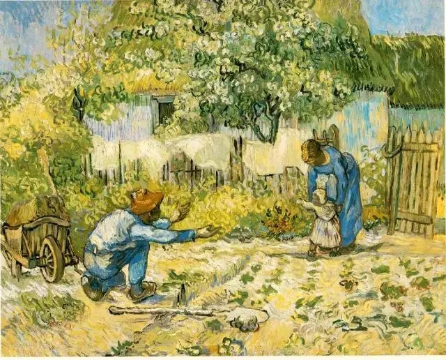 这作品是梵高临摹自米勒的同名作品。画面是一个农村的耕地,背面是农民的房屋。画的右方一位农妇扶着小女儿帮助她学步。左方女婴的农民父亲蹲在地上张开双手鼓励她向前走。