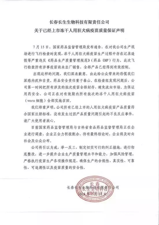 7月15日下午,国家药监局发布的一则通告显示,长春长生生物科技有限责任公司(长春长生)因冻干人用狂犬疫苗生产存在记录造假等违法违规行为,遭药监部门立案调查并没收药品GMP证书,责令停止生产。