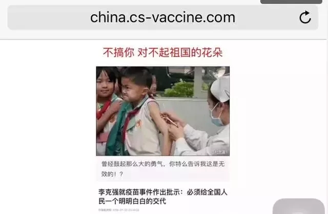 长生生物科技股份有限公司官网首页被黑客攻击,并配图“不搞你,对不起祖国的花朵”。