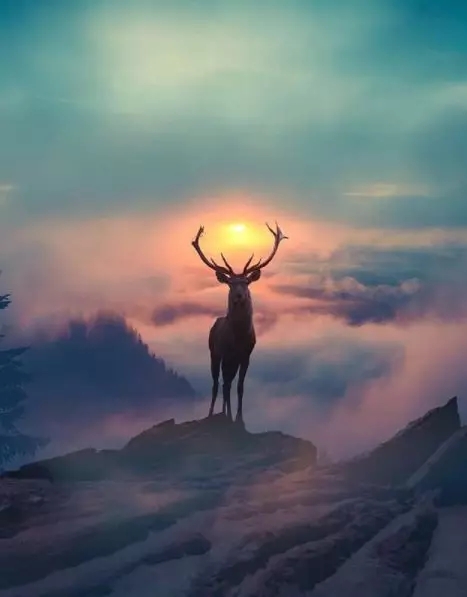 一头雄赳赳的公鹿立于山巅,加上夕阳的光晕,这不就是神鹿吗?