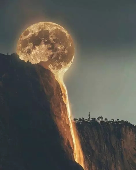这张拍摄于约塞米蒂国家公园的照片里,月亮好像随着瀑布一泻而下。