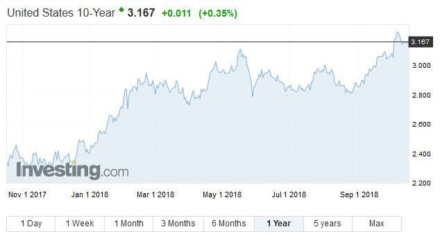 10 年美债殖利率 8月开始时为 3.0%,8 月底以 2.85% 收尾, 17 日下午 1 时许,暂报3.167%,债券价格与殖利率成反向走势。