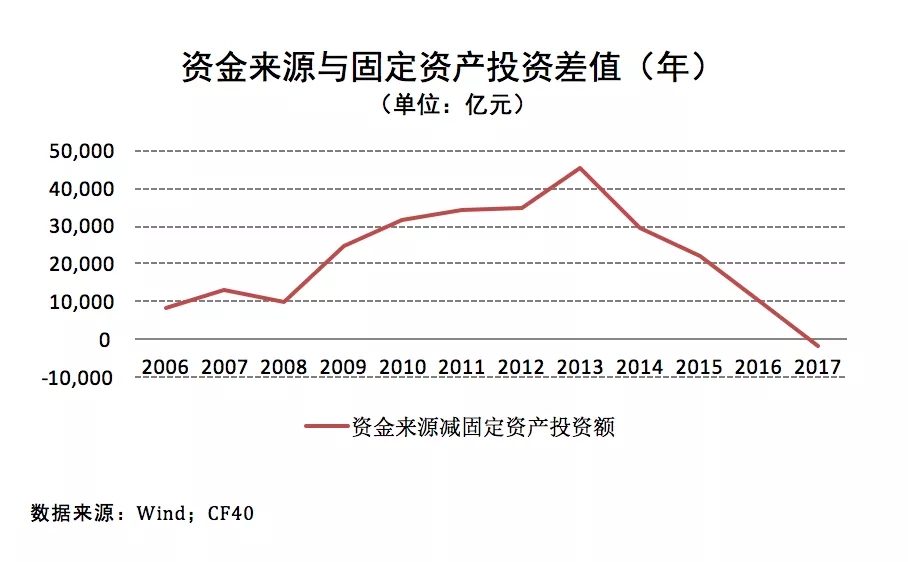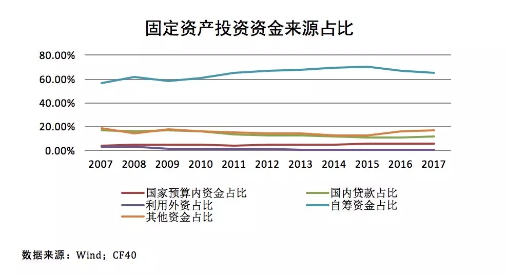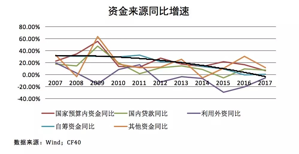 固定资产投资的资金来源主要分为五大类,分别是国家预算内资金、国内贷款、利用外资、自筹资金和其他资金。其中自筹资金占比最高,2010年以后超过60%。2013年固定资产投资资金来源与固定资产投资完成额的差值为4.53万亿,2014年为2.96万亿,逐年降低至2017年的-1869亿。而资金来源增速方面,截至2017年,国家预算内资金、其他资金同比增速总体呈波动状态,自筹资金同比增速下降(黑色为趋势线),利用外资的同比增速上升。需要注意的是,随着中美贸易摩擦不断升级,未来的外资增速可能放缓甚至为负增长。