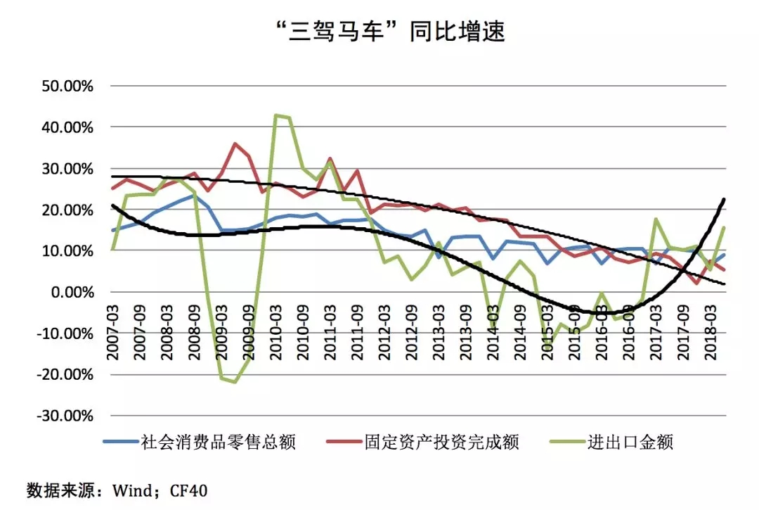 据国家统计局数据测算,2010年以来,消费支出对中国经济增长的贡献率逐步上升,2010年低于40%,2017年已经超过了65%。进出口对中国经济的拉动作用总体上呈现水平波动的趋势,2016年对经济增长的贡献率为负值,2017年为正。从净出口角度来看,对经济增长的贡献率总体呈现下降趋势。如下图,2010至2016年上半年,进出口同比(黑色为趋势线)增速下降。2016下半年至2018年,进出口同比增速上升。2018年1-9月份,进出口同比增速除3月份外均超过12%,5月和8月同比增速均超过18%,9月增速为14.4%,超过去年同期增速12.88%,对经济增速的贡献率为正。而随着中美贸易摩擦的影响逐渐显现,全球经济不确定性增加,2018年一整年的出口对中国经济增速的拉动作用存在很大的不确定性,可能为负,但并不能解释今年的经济增速放缓的趋势。