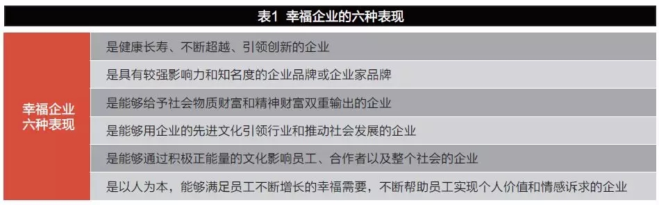 清华大学社会科学学院院长、清华大学社会科学学院心理学系系主任彭凯平教授,则从积极心理学的角度研究幸福企业的建设。基于积极心理学的相关理论及多年的实践经验,彭凯平教授提出幸福企业的六种主要表现、三个维度。其中六种表现是:幸福企业是健康长寿、不断超越、引领创新的企业;是具有较强影响力和知名度的企业品牌或企业家品牌;是能够给予社会物质财富和精神财富双重输出的企业;是能够用企业的先进文化引领行业和推动社会发展的企业;是能够通过积极正能量的文化影响员工、合作者以及整个社会的企业;是以人为本,能够满足员工不断增长的幸福需要,不断帮助员工实现个人价值和情感诉求的企业(见表1)。