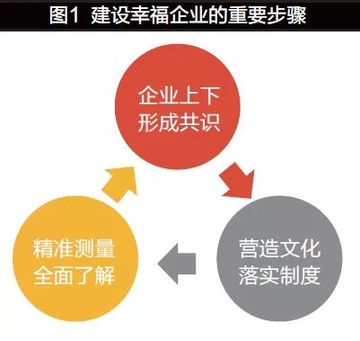 幸福企业建设工作可主要从三个方面入手:首先,企业管理层需要形成幸福企业建设的强烈意识,并在企业中自上而下地进行宣传引导,使员工达成共识;第二,营造良好的文化氛围,制定并落实幸福企业建设的相关制度措施;第三,对企业进行精准测量,全面了解企业的发展与财务状况以及员工的身心健康(见图1)。