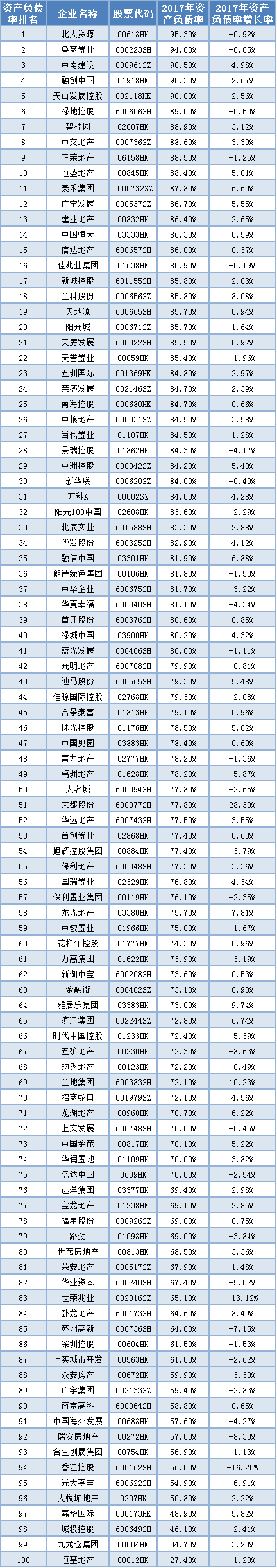 睿信地产研究院根据2017年上市地产企业披露数据,对已披露销售额数据的前100名企业的资产负债率及净有息负债率进行统计分析,并根据2017年的资产负债率及净有息负债率进行排序,具体情况如下: