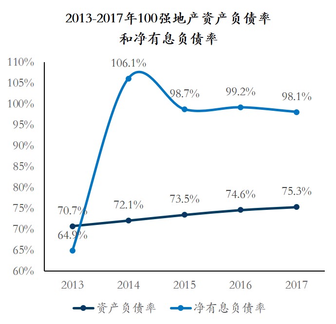 地产企业负债率在60%-80%间较为合理,超过85%则面临着一定的财务风险。近五年,百强房企资产负债率保持平稳趋势,波动幅度不大,2017年平均负债率为75.3%,处于合理范围;净有息负债率自2014年后一直高位运转,2017年平均净有息负债率98.1%,表明百强房企在2014年以后不断举债加杠杆,承受着较大的财务风险和负债压力。