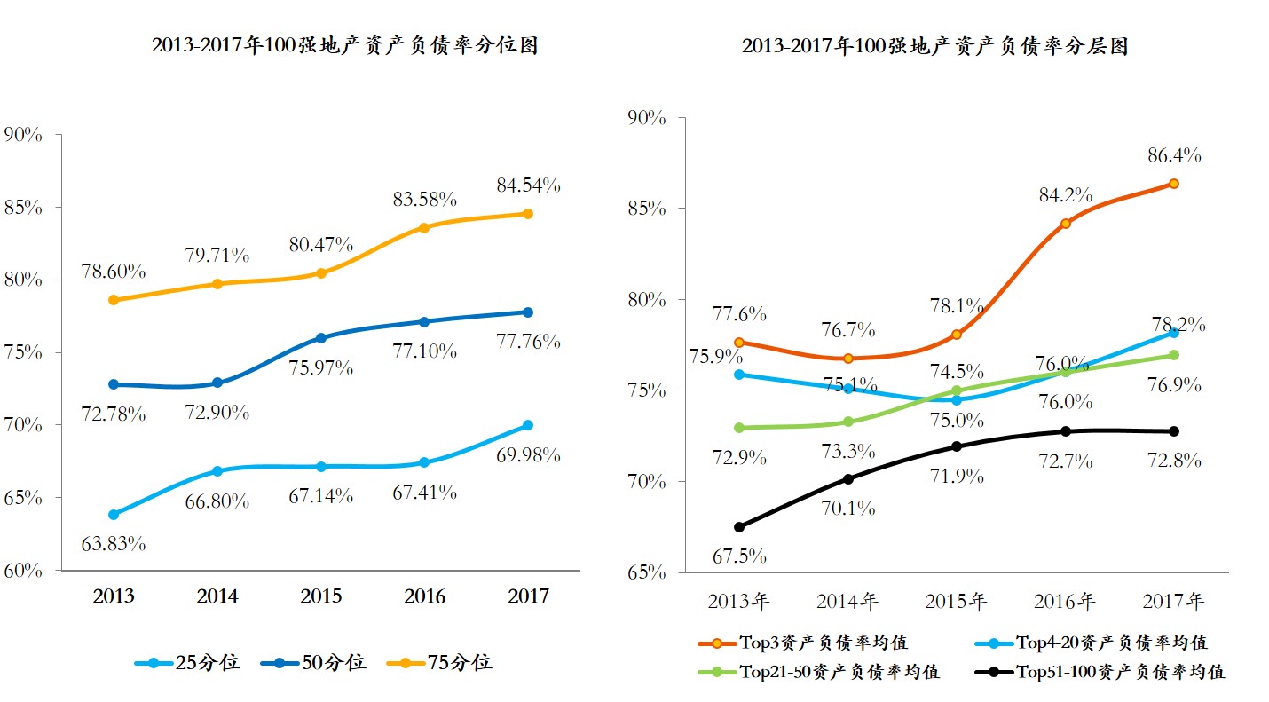 资产负债率数据上,75分位、50分位、25分位的分位值分别为84.5%、77.8%、70.0%,各分位值较上年小幅上升,但总体仍以稳定为主。2017年TOP3企业资产负债率达到86.4%,超过85%的风险临界值,其他层级企业的资产负债率保持在70%-80%间。其中北大资源、鲁商置业、中南建设、融创中国、天山发展控股的资产负债率超过了90%,绿地控股、碧桂园、中交地产、正荣地产、恒盛地产等17家企业资产负债率也超过了85%,企业财务风险敞口较高。