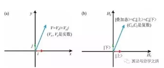 一个粒子的自旋叠加态,可以表示成这两个基态(自旋本征态)的线性叠加,如图1(b)所示,