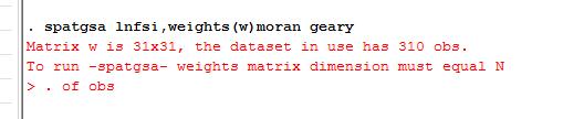 spatgsa lnfsi,weights(w)moran geary