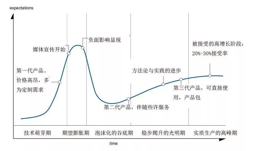 借助一个用于描述技术发展周期的专业术语「Gartner曲线」来说,一个事物从萌芽到成熟,必然要经历五个阶段,即:启动期→高峰期→低谷期→爬坡期→饱和期。