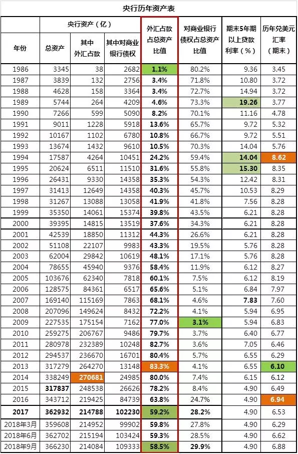 话说支撑我大中国货币信用最关键的因素,就是强制兑换美元,以形成外汇占款。外汇占款就是我大中国的基础货币,乃是我大中国央行最重要的资产,没有之一。下表给出的是我大中国从1986年至今的央行资产构成数据演变表,我同时还给出了历年末的长期贷款利率以及兑美元汇率,供各位查阅。下面这张表非常非常的重要,尤其是外汇占款占央行总资产比值的演变列,我在下表中给予了重点强调,希望各位能够点击大图,认真阅读。