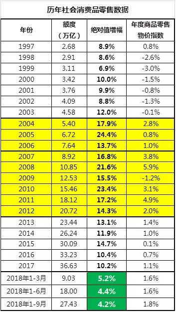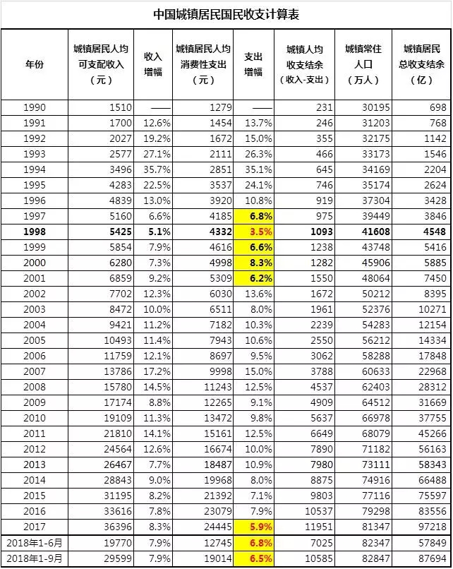对于上面的表格,有两个地方需要各位注意,首先,就是这个收支结余的概念,可支配收入减去消费性支出所得出的收支结余,是一个非常重要的数据,这是所有奢侈性消费的根基,比如出国旅游,必须买名牌包包,比如最重要的,买房。其次,就是居民消费性支出增幅的演变趋势。1997年-2001年,国企大下岗时代,我大中国城镇居民消费支出的增幅长期处于6-8%的区间,最低的1998年只有3.5%。此后伴随着中国加入世贸,并因此成长为全球基础制造业中心,居民的消费能力逐渐复苏,消费支出增幅长期维持在10%以上。这种兴旺的局面一直维持到2013年,居民的消费支出能力开始转弱,到2017年之后该数据下降到6%左右,2018年前三季度为6.5%。