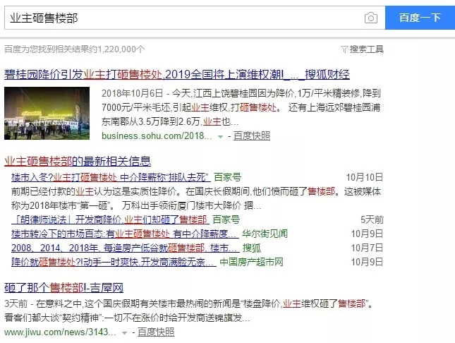 各位必须了解的是,这几个月来,我大中国的房地产市场发生了什么:打砸售楼部,开始在我大中国各地纷纷重新上演。厦门万科房价腰斩,业主去砸售楼部;合肥绿地房价7折,业主去砸售楼部;广州保利房价7折,业主去砸售楼部;上海碧桂园房价75折,业主去砸售楼部。如下图所示,用“业主砸售楼部”去搜,能搜到近期的一大堆此类新闻。全国主要城市的房地产市场,确确实实是在萎缩了。就算还剩下几个情况特殊的,也只不过是在苟延残喘而已,已经无从阻止市场萎缩的浪潮了。