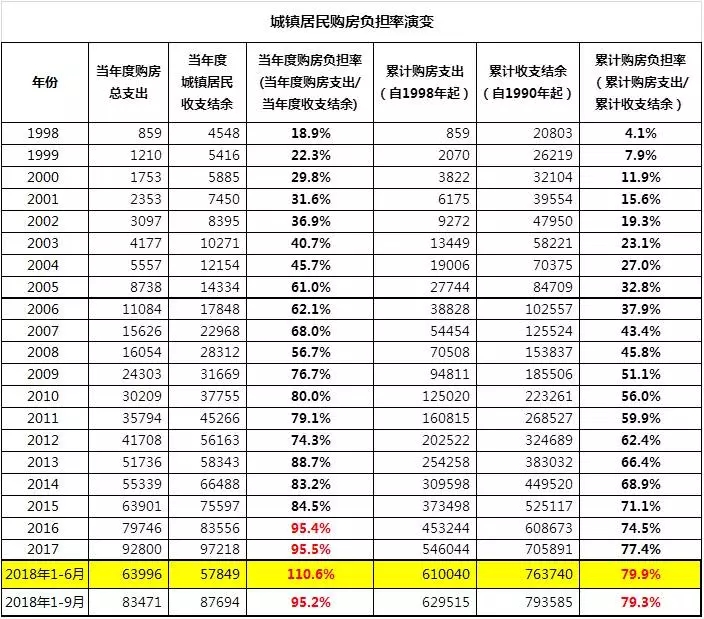 言归正传,结合上面的收支结余数据和购房支出数据,我们可以很容易的算出居民的购房负担率数据了。见下表。
