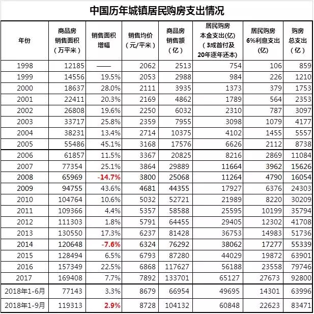 对上表的计算结果,在这里需要简单验算一下:1998年至今年3季度的商品房累计销售额为95.26万亿,扣除累计的居民购房本金支出44.81万亿,还欠50.45万亿。这就是居民购房总负债规模。这个数据需要有其它数据来进行印证。根据央行的数据,截止2018年9月底全国居民贷款余额规模为46.22万亿,这些贷款基本上都是购房贷款,真正的个人消费贷款极少,打着个人消费贷款名义套钱出来买房的才是主流。再加上4.5万亿的公积金贷款余额,居民贷款总余额为46.22万亿+4.5万亿=50.72万亿。两个数据几乎完全一致,足以相互应证,形成强大的数据逻辑链,无可质疑。在这里我必须吐一下槽:我大中国从1998年搞房地产,到现在足足搞了21年,其结果就是地产商欠了33万亿的债,老百姓欠了50万亿的债,合计83万亿的地产债,这事真是不知从何说起。