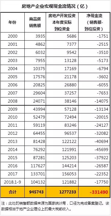 上表给出的,是从2000年至2018年前三季度的房地产企业宏观现金流情况。老蛮我本来打算直接给出从1998年中国开始商品房地产开发那一年的数据,以展现更清晰的全貌,不过地产开发投资实际到位资金数据从2000年才开始统计,也是没法子,无法完美,当然现在的数据与全貌也不会有什么差异了。各位可以惊讶的看到,从2000年至今,房地产公司们的销售收入合计94.57万亿,但实际用于开发投资的资金规模高达127.7万亿,两者之间的差值33.15万亿元,就变成为了房地产公司的负债,以及资产端的在建工程,也就是储备开发面积。