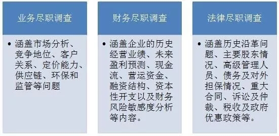 尽职调查主要可以分为业务尽职调查、财务尽职调查和法律尽职调查大三部分。