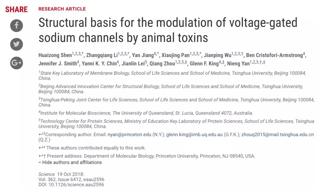 颜宁组的第二篇论文,题为Structural basis for the modulation of voltage-gated sodium channels by animal toxins,则是运用冷冻电镜解析动物毒素对电控离子通道调控的结构基础。这一工作是与澳大利亚昆士兰大学Glenn King组合作。论文通讯作者除此二人之外,还有清华大学的周强。