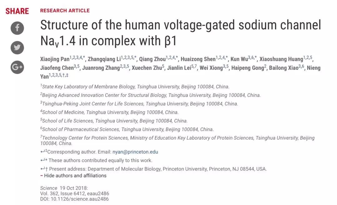 (10月19日),国际顶尖期刊Science发表了最新一期的研究长文 (Research Article)。本期研究长文仅有3篇,其中2篇来自原清华大学教授颜宁课题组,文章中解析了电控钠离子通道精细结构。
