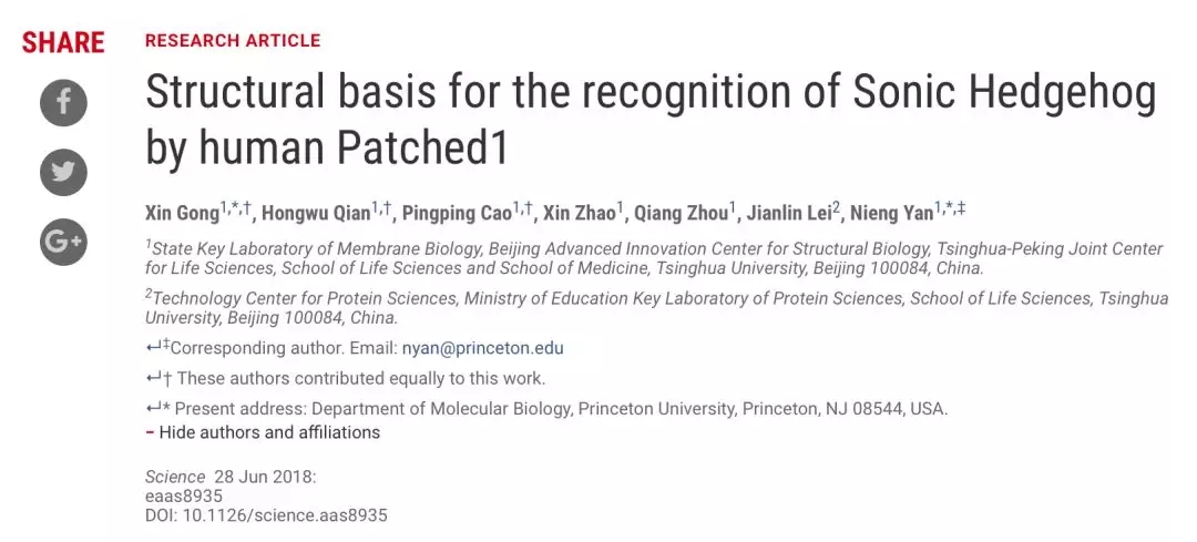 除了上述两篇文章外,2018年6月29日,颜宁研究组也曾在《科学》(Science)杂志在线发表了题为《人源Patched1蛋白识别Sonic Hedgehog的结构基础》(Structural basis for the recognition of Sonic Hedgehog by human Patched1)的研究长文。