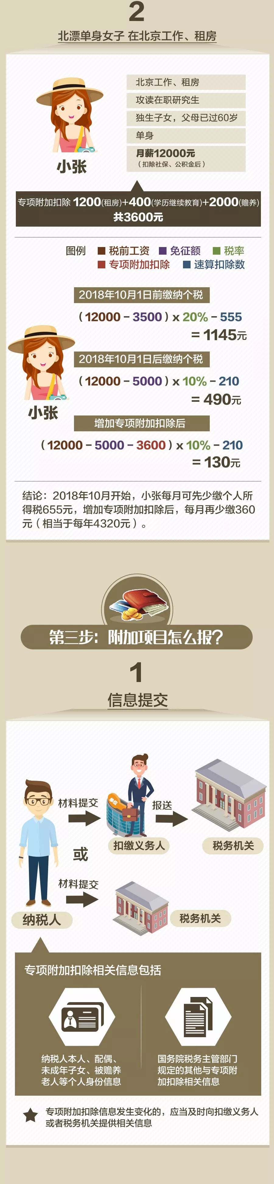 《暂行办法》明确了个人所得税法规定的子女教育、继续教育等6项专项附加扣除的具体实施办法。享受这些专项附加扣除,需要哪些条件?通过这些扣除项目,纳税人可以少缴多少个税?跟随下面这张图,一起来算算。