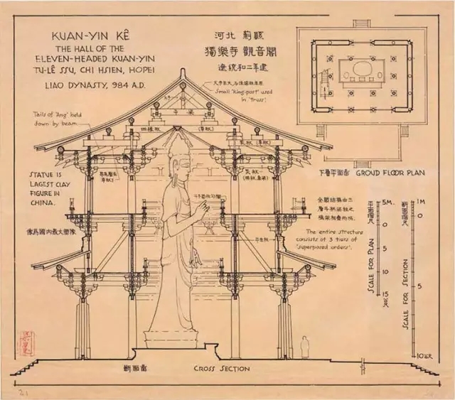 左边是梁思成和莫宗江手绘的立面图,右边是木塔的照片