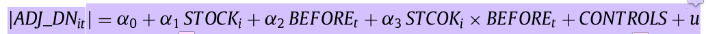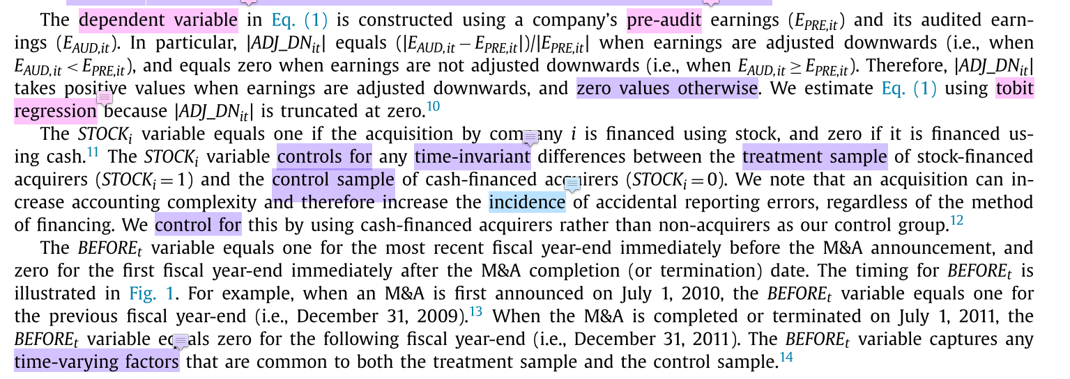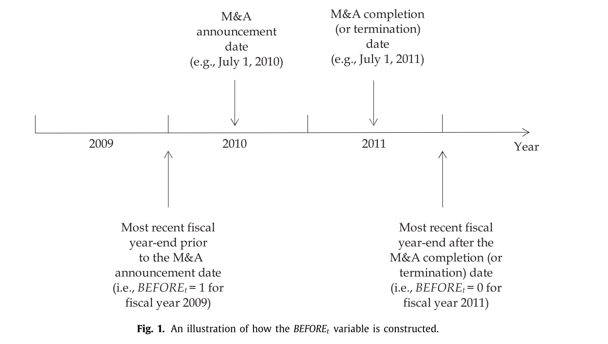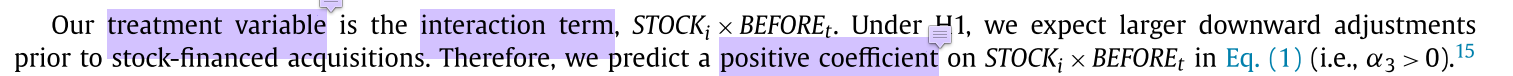 等式左边是因变量,等式右边第一个是常数,第二个变量STOCKi等于1或0,等于1时代表收购方以股票融资方式收购(treatment sample),等于0时代表收购方以现金方式收购(control sample),然后第三个变量BEFOREt等于1或0,等于1时代表时间点为收购当年的前一年财政年度年末,等于0时代表时间点为收购当年的后一年财政年度年末。然后第三个变量是(treatment variable)是一个交互项。