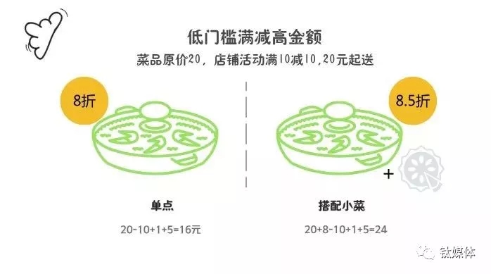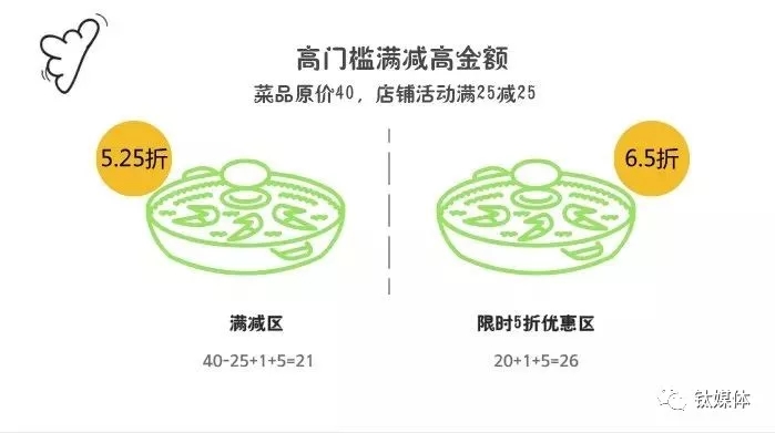 如满25减25,一般商家会把主推餐品设置成两个价格,一个为原价,一个为限时5折的活动价,顾客购买原价餐品和活动餐品费用相差不大,商家仍有利润空间。
