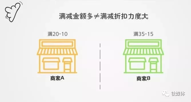 折扣力度大小=满减金额/满减门槛,所以上图两个商家的折扣力度分别是0.5(10/20)和0.42(15/35),前者折扣力度更大。