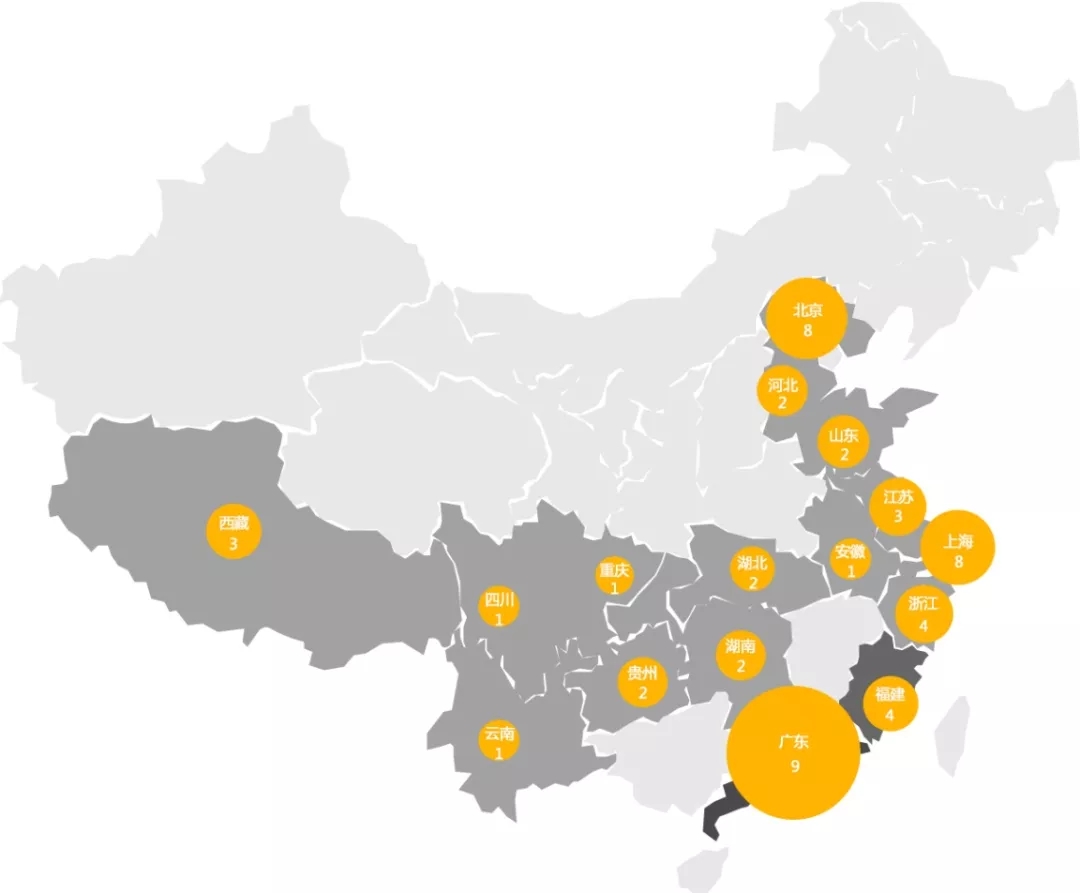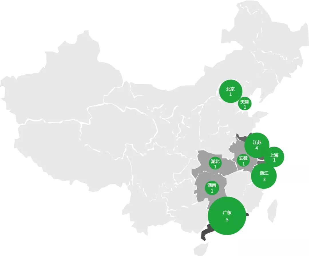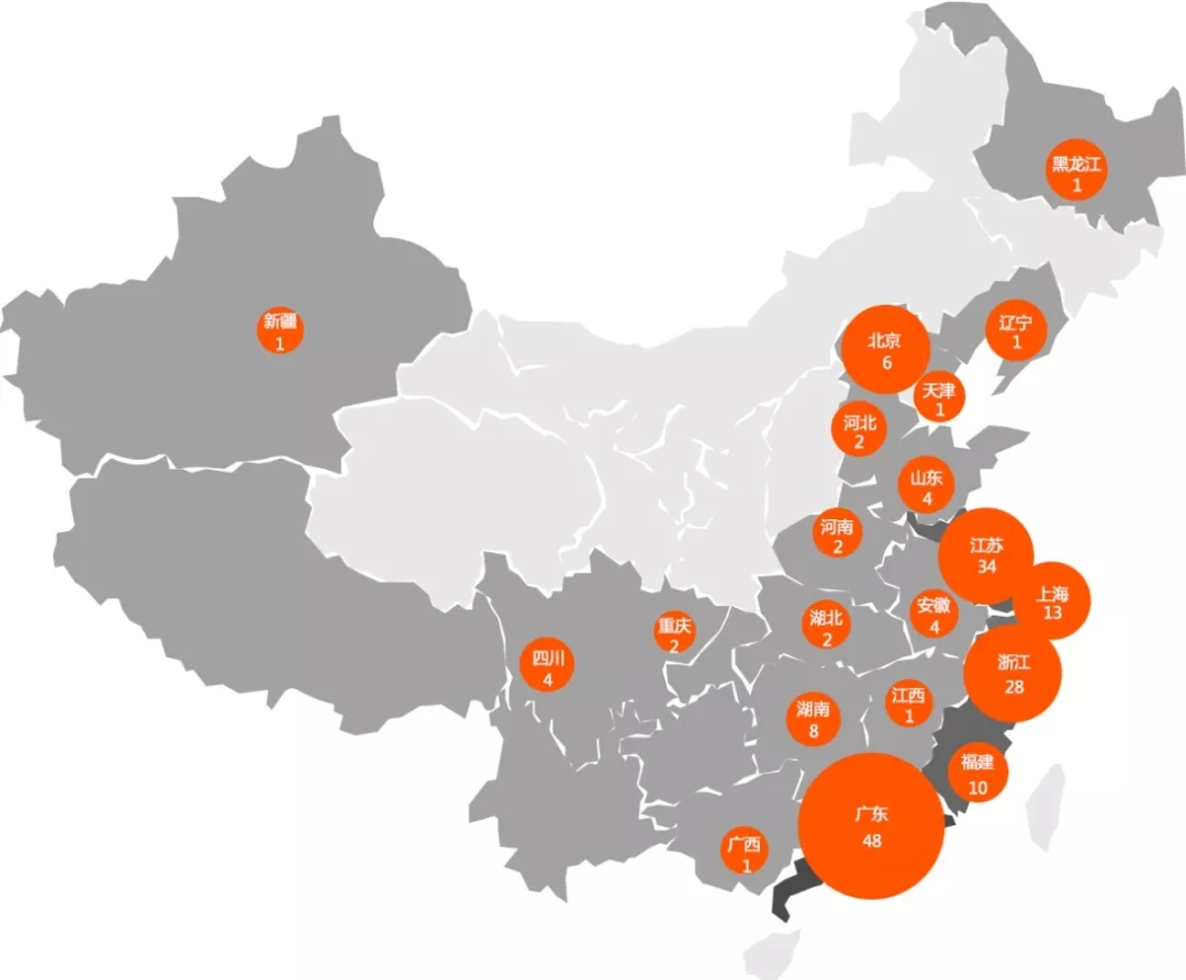其中分领域来看,234家中从全国分布来看,主要聚集在珠三角、长三角地区,但其他地区开始后发先至。整体的分布区域图如下: