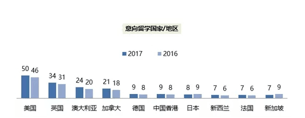 综合看来,美国连续三年是留学首选,英联邦国家紧随其后,且占比均高于2016年。德国、中国香港、新西兰和法国的占比也有小幅提升,留学目的国分布格局较稳定。