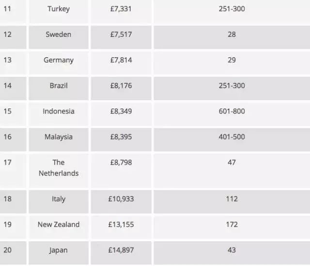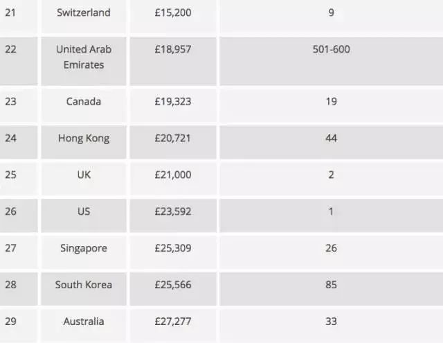 Top5-10中热门国家为:英国第5(2.1万英镑,约18.5万人民币一年)、中国香港第6(2.0721万英镑)、加拿大第7(1.9323万英镑)。