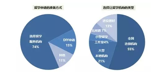 和2016年相比,留学咨询服务机构仍是计划留学人群准备留学申请的主流方式,但比例从60%上升至74%,说明越来越多的人选择专业的留学服务机构,DIY留学人群仍是少数,仅占到15%。