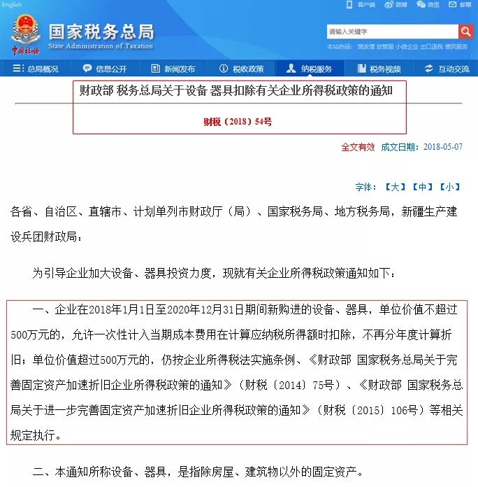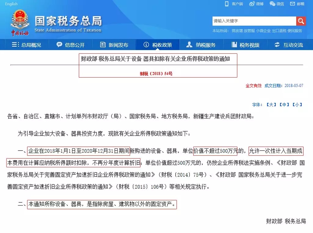 5月7日,税总发布财税【2018】54号文,规定了“企业在2018年1月1日至2020年12月31日期间新购进的设备、器具,单位价值不超过500万元的,允许一次性计入当期成本费用在计算应纳税所得额时扣除,不再分年度计算折旧。”