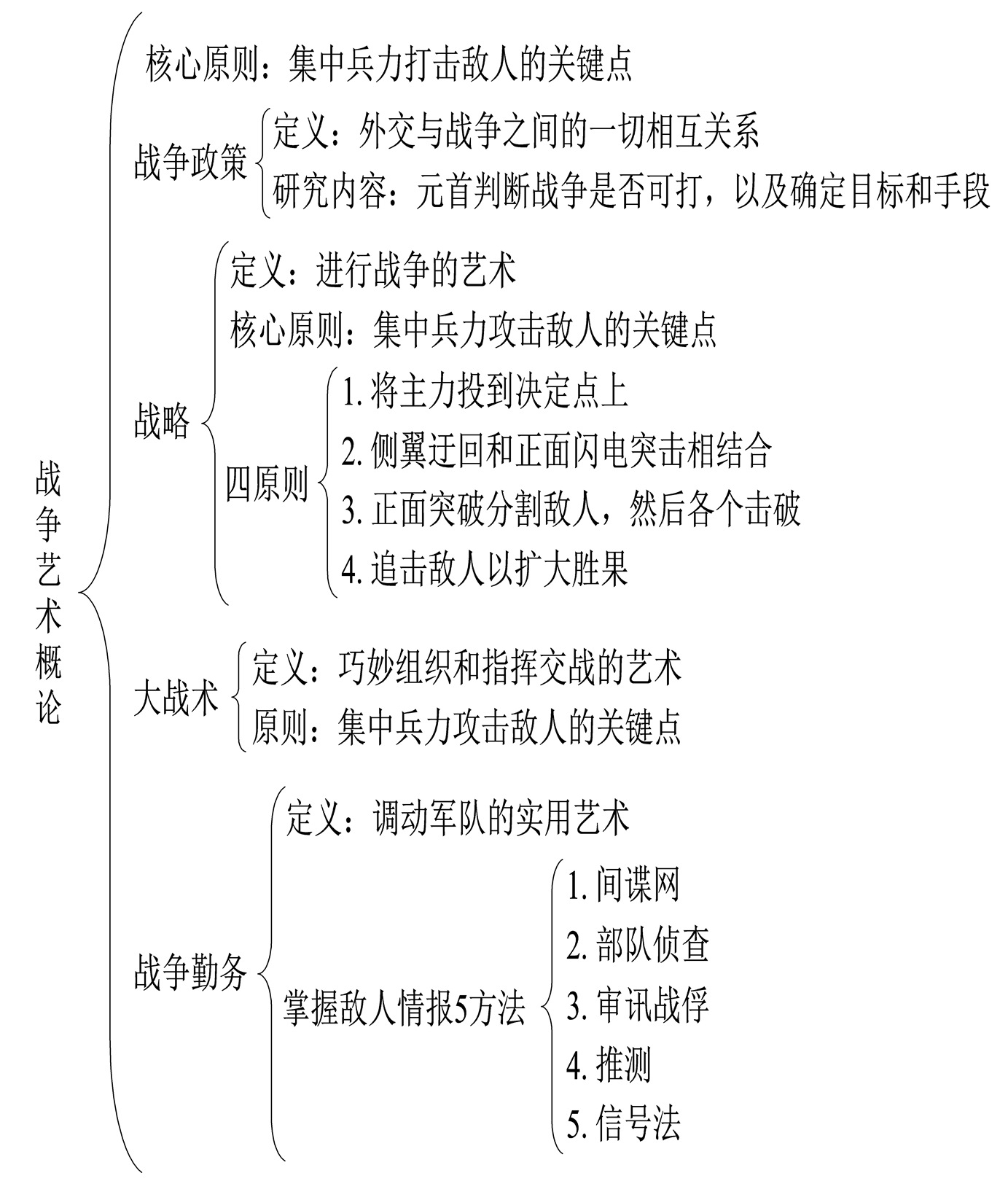 《战争艺术概论》将战争分成了6部分,分别为战争政策、战略、大战术、战争勤务、工程艺术和基础战术,《战争艺术概论》只研究前四部分。《战争艺术概论》的核心原则是集中兵力打击敌人的关键点。战略四原则为:1) 将主力投到决定点上。2) 侧翼迂回和正面闪电突击相结合。3) 正面突破分割敌人,然后各个击破。4) 第四条是追击敌人以扩大胜果(如图1所示)。