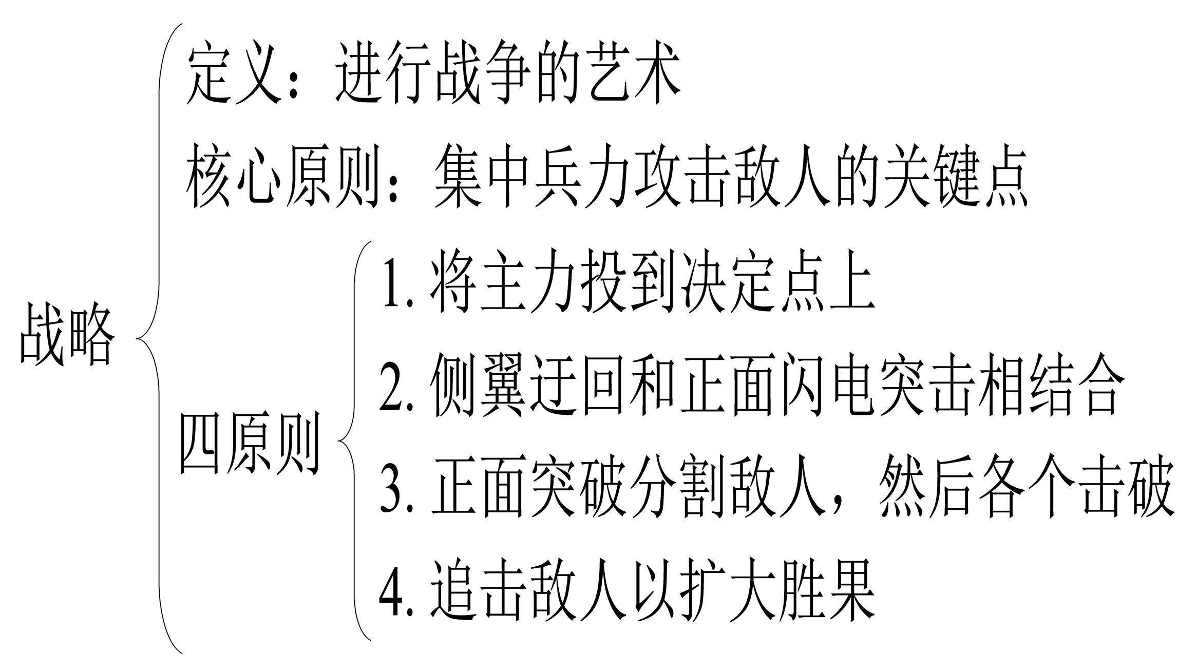 战略是全书的核心内容,战略的定义是:战略是进行战争的艺术。战略的核心原则是:集中兵力攻击敌人的关键点。战略的原则可以分成四原则: