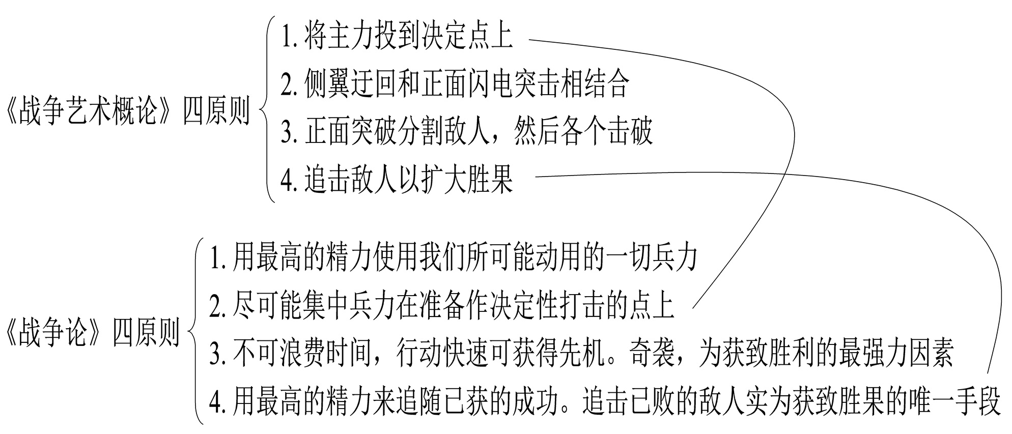 《战争艺术概论》的战略四原则和《战争论》的战略四原则有相同也有不同的地方。《战争艺术概论》的第一条原则“将主力投到决定点上”和《战争论》的第二条原则“尽可能集中兵力在准备作决定性打击的点上”表达的意义相同;《战争艺术概论》的第四条原则“追击敌人以扩大胜果”和《战争论》的第四条原则“用最高的精力来追随已获的成功。追击已败的敌人实为获致胜果的唯一手段”相同。《战争艺术概论》的第二条原则“侧翼迂回和正面闪电突击相结合”和第三条原则“正面突破分割敌人,然后各个击破”是《战争论》所没有的。而《战争论》的第一条原则“用最高的精力使用我们所可能动用的一切兵力”和第三条原则“不可浪费时间,行动快速可获得先机。奇袭,为获致胜利的最强力因素”是《战争艺术概论》所没有的(如图3所示)。