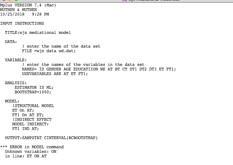 MPLUS 做中介变量,报错时 显示 :未知变量 ON