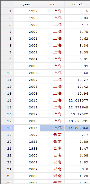 意思就是,比如,在上海市后面添加2015年的total=(14.232363+13.678791+13.12522)/3 2016年的total=(total2015+total2014+total2013)/3 。然后其他省份的也是如此。