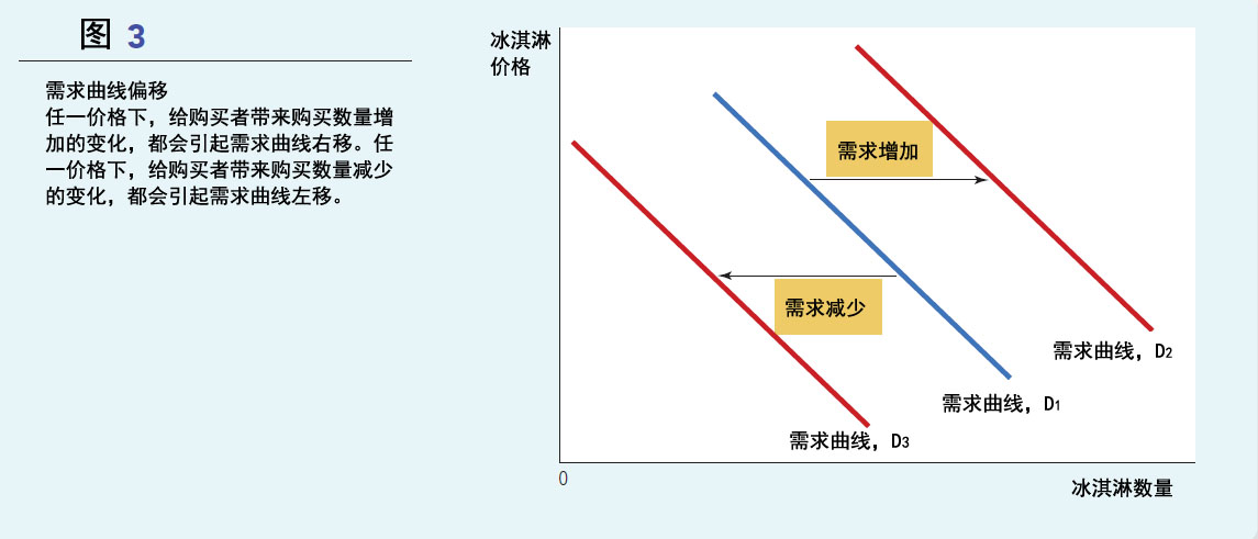 图3呈现了需求曲线的移动。任一价格下,需求数量的增加,比如我们所假想的美国医学会新发现,都会造成需求曲线向右偏移,这被称为“需求增加”。任一价格下,需求数量的减少,都会造成需求曲线向左偏移,这被称为“需求减少”。