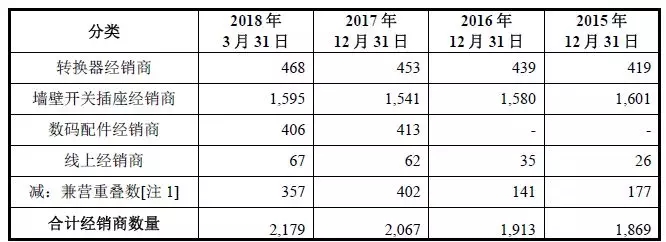 公司建立了扁平化经销体系,对经销商实施买断式销售。公司经销体系包括转换器、墙壁开关插座、数码配件三大线下经销商体系和线上经销体系,在三大线下体系内实行分区域独家经销。报告期内,公司经销商数量情况如下: