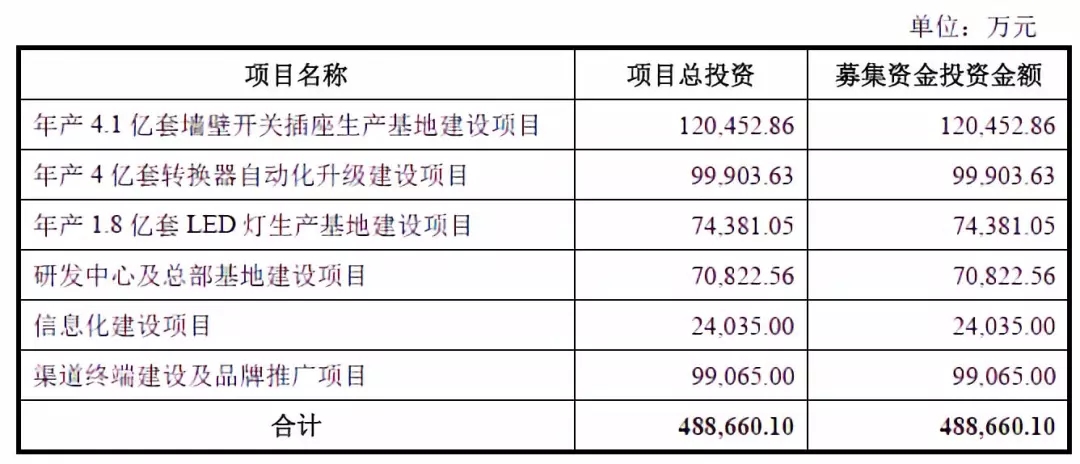 这其实在是公牛集团销售模式中对经销商店头招牌投放考核的结果(公牛集团定期及不定期对经销商店头招牌等网点资源的实际投放情况进行考核,再按照既定政策计算得出经销商应享有的折扣)。公牛集团2017年销售6亿多件产品,平均下来每个家庭都有消费一件公牛的产品。9月28日,公牛集团赶在财务数据有效的最后期限内在证监会网站披露了的招股说明书。公牛集团拟定于上交所上市,拟发行不超过6,000万股,拟募资48.86亿元,募集资金依轻重缓急拟用于以下项目的建设: