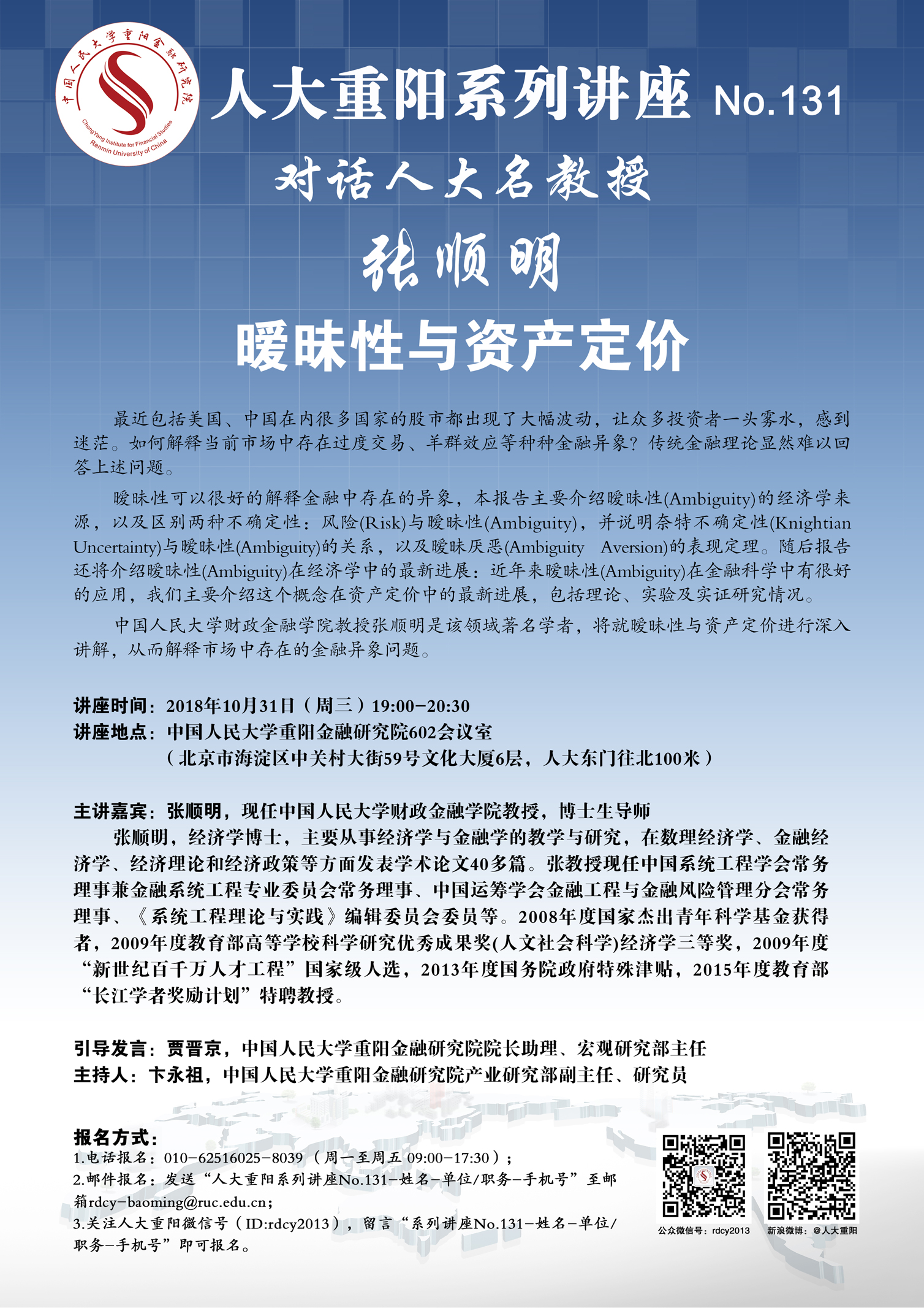 中国人民大学财政金融学院教授张顺明是该领域著名学者,将就暧昧性与资产定价进行深入讲解,从而解释市场中存在的金融异象问题。