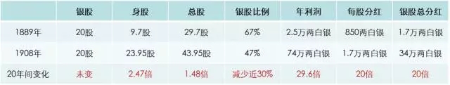 大德通票号1889年银股为20股,身股9.7股;而到了1908年,银股仍为20股,身股却增至23.95股。东家拿的是银股,不参与企业具体管理的。具体经营票号的是一群大掌柜和小掌柜,掌柜靠他的经营才能拿身股,每年可以拿到票号的分红。从1889年到1908年20年间,银股的比例虽没变,但由于整个蛋糕做大了,分红总额增大,股东最终所分得的银子大大增加了。
